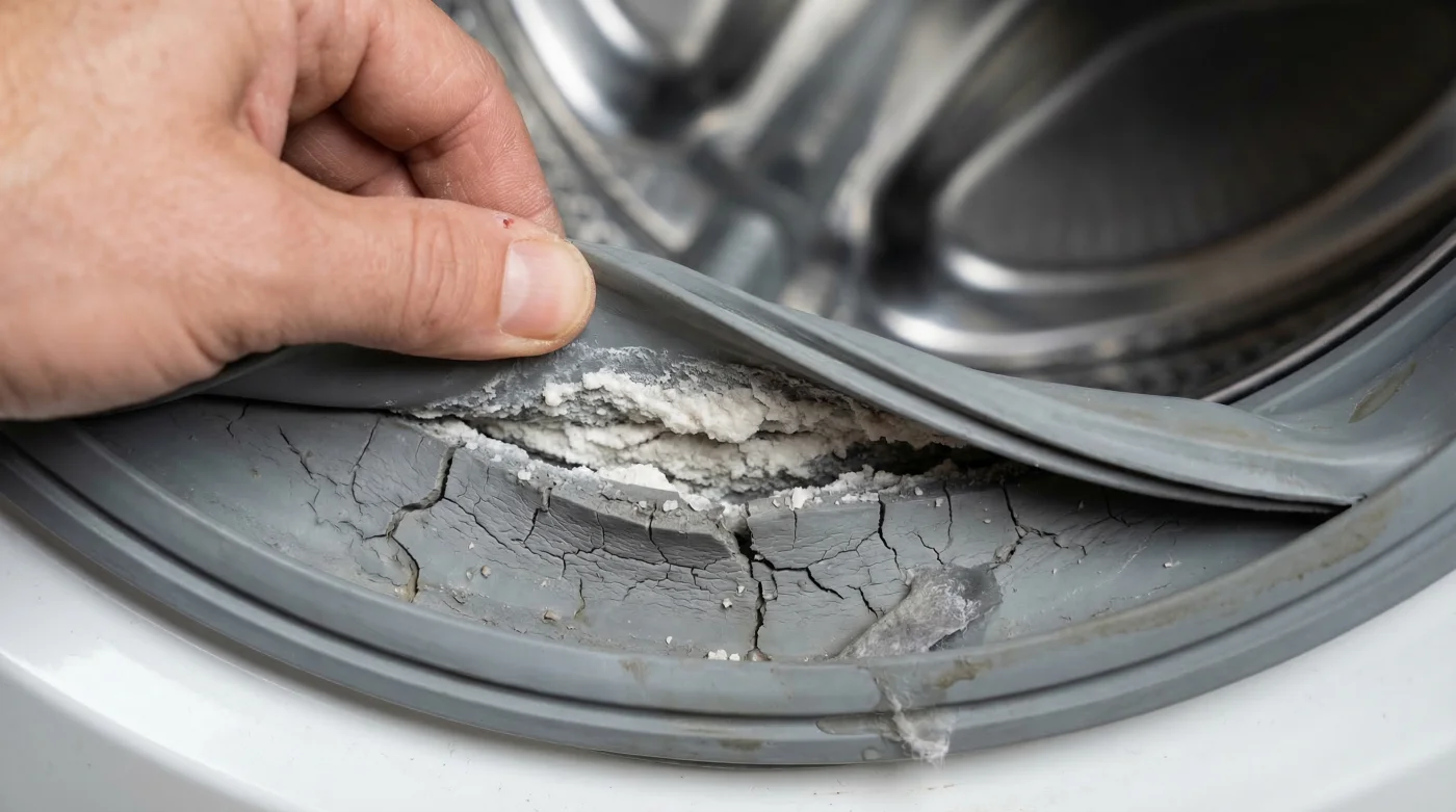 If you have been a dedicated user of traditional alkaline cleaning powders, it is absolutely imperative to audit your appliance’s health immediately. Gently pull back the thick folds of the rubber door gasket and inspect the innermost hidden crevices. You are physically feeling for flexibility; the rubber should easily yield to gentle thumb pressure and snap back instantly to its original shape. If it feels like rigid plastic, or if greyish-black sticky residue coats your fingertips, the irreversible process of chemical erosion has already begun to take hold.